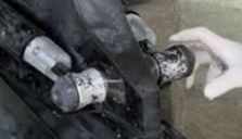 Den Antrieb jetzt ablassen und auf z.B. einem Stück Holz mit der Finne aufsetzen. Die Lenkung muss gerade stehen !